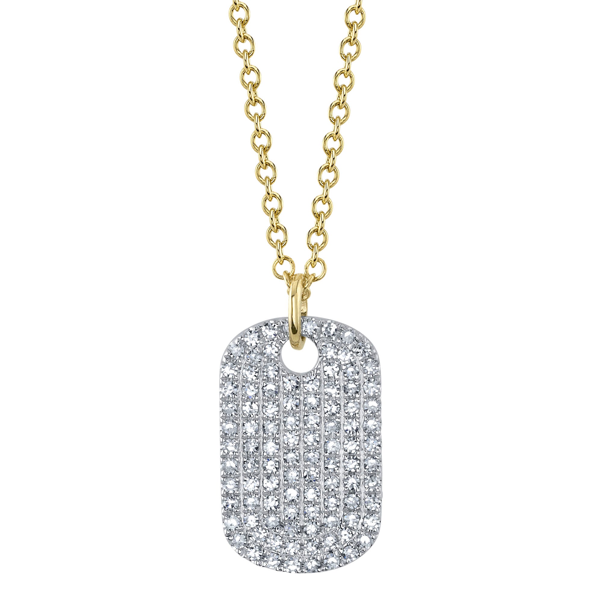 This 14K yellow and white gold dog tag pendant is elevated with .22tw of sparkling diamonds, blending modern edge with refined elegance. Its versatile design makes it perfect for layering or wearing solo as a bold, contemporary statement piece.