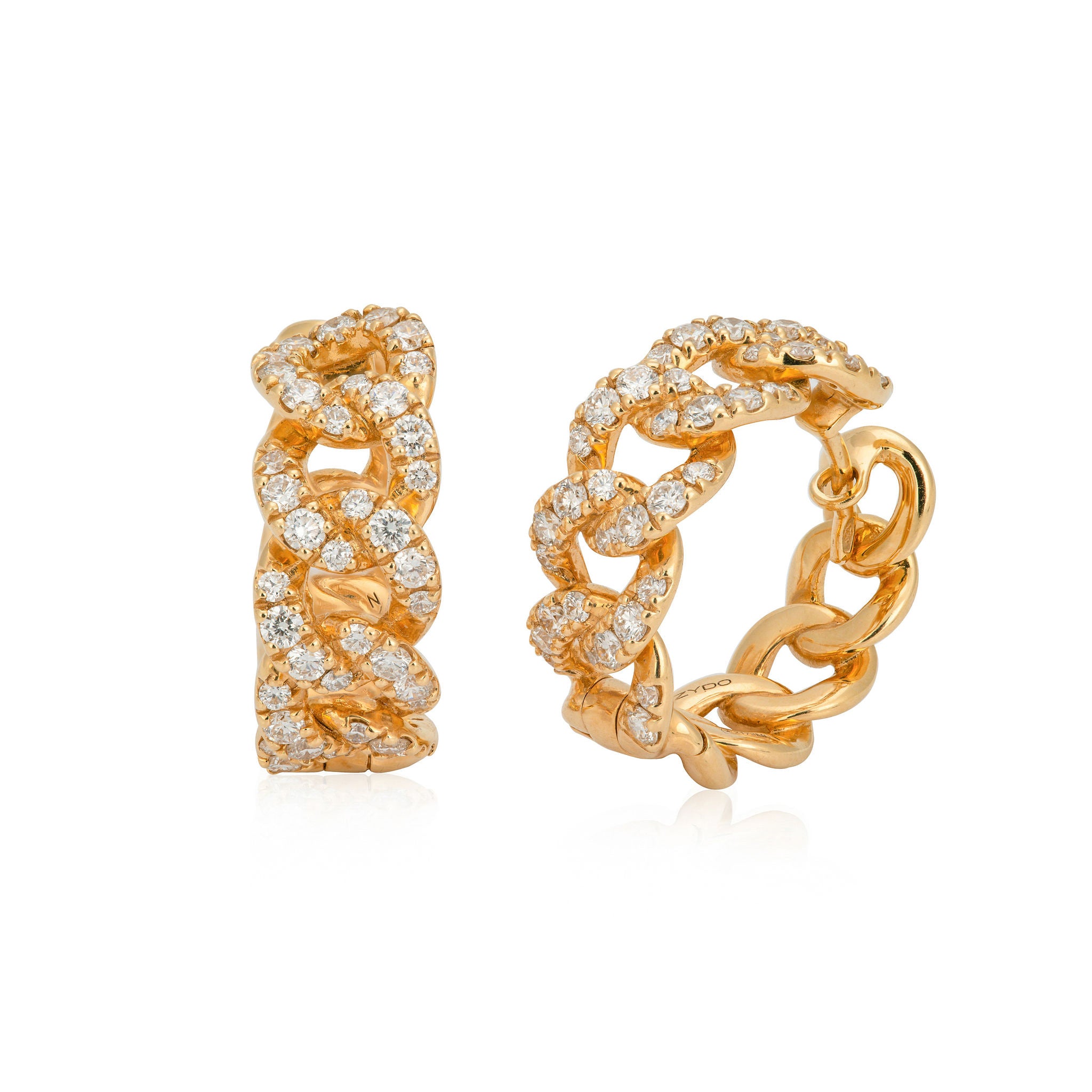 Make a bold statement with these luxurious diamond Cuban link hoop earrings, expertly crafted in warm 18K yellow gold. The iconic chain design features 1.12 carats total weight of brilliant diamonds pavé-set along each link, creating maximum sparkle and dimension. These versatile hoops effortlessly transition from day to evening, adding an elevated touch of glamour to any look.