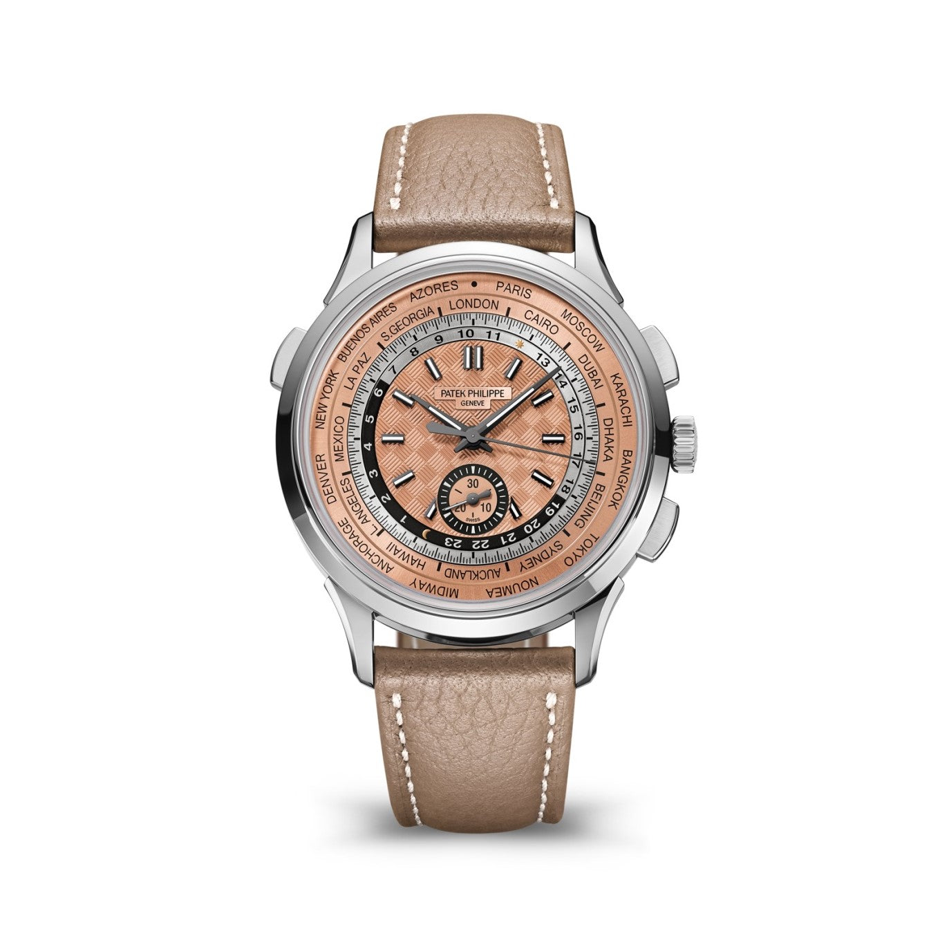 A combination of two emblematic Patek Philippe complications, this self-winding flyback chronograph World Time model in steel is distinguished by its sporty, vintage style. The opaline rose-gilt dial features a carbon-patterned center adding a modern, dynamic touch. The World Time function displays the time in 24 time zones simultaneously and whenever required.