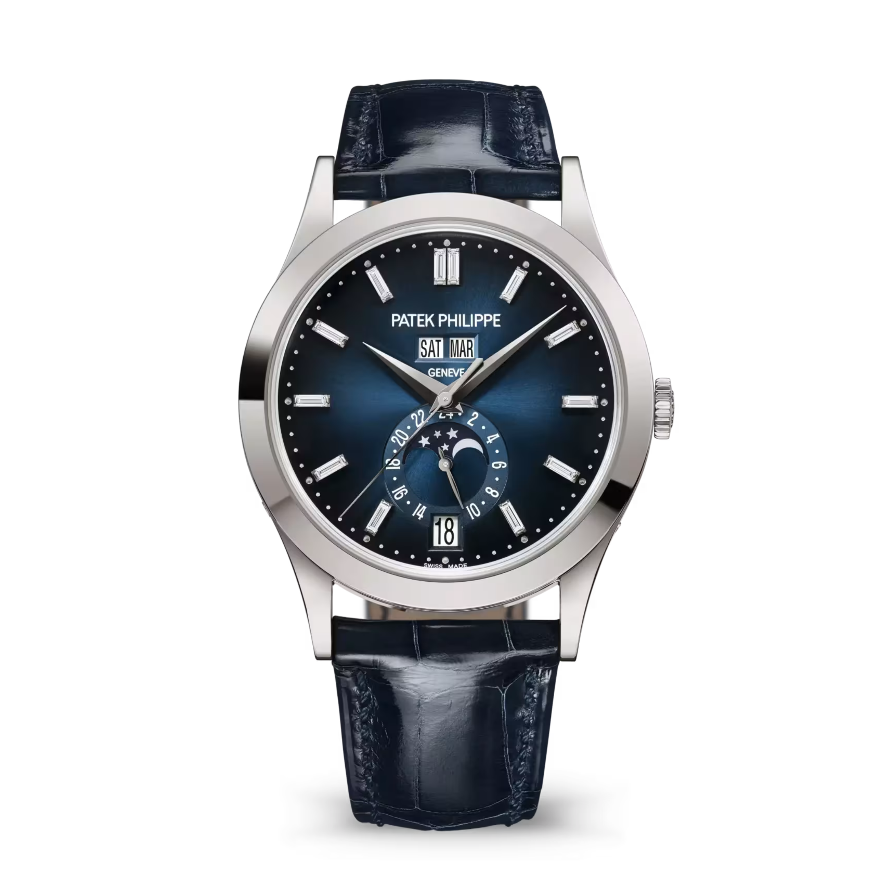 Annual Calendar Reference 5396 (with double day/month aperture at 12 o'clock and date aperture at 6 o'clock) in a white gold version. The blue sunburst dial with black-gradient rim is discreetly enhanced by the sparkle of 12 baguette-cut diamond hour-markers – an elegant contrast highlighting the extremely understated, legible design.