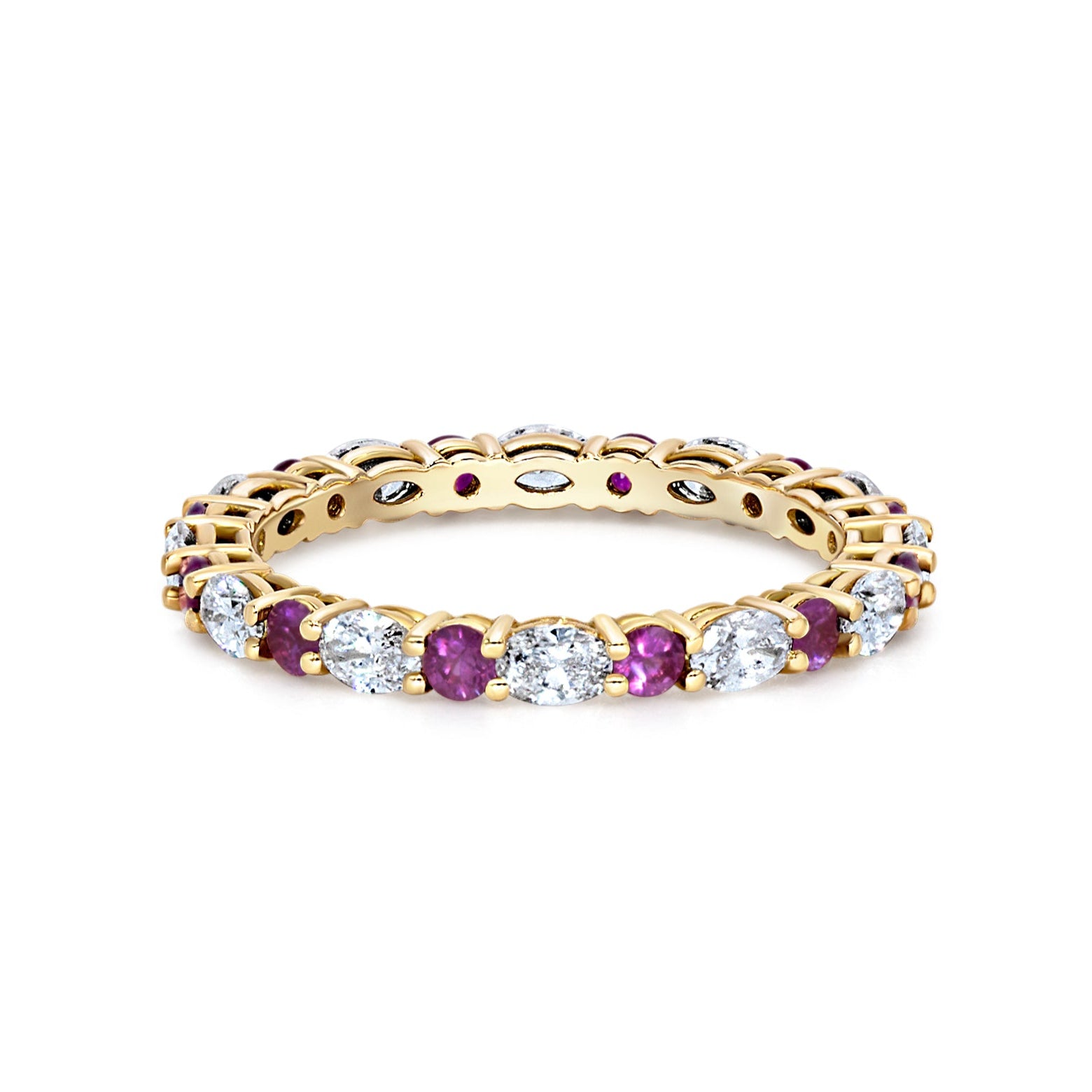 Feminine and elegant, this Diamond & Pink Sapphire Eternity Band features 12 round brilliant diamonds (.91 total carat weight), graded F color and VS-SI clarity, paired with 12 vibrant pink sapphires (.52 total carat weight), all set in warm 18K yellow gold. Perfect for stacking, marking a special occasion, or adding a joyful pop of color and sparkle to any jewelry collection.