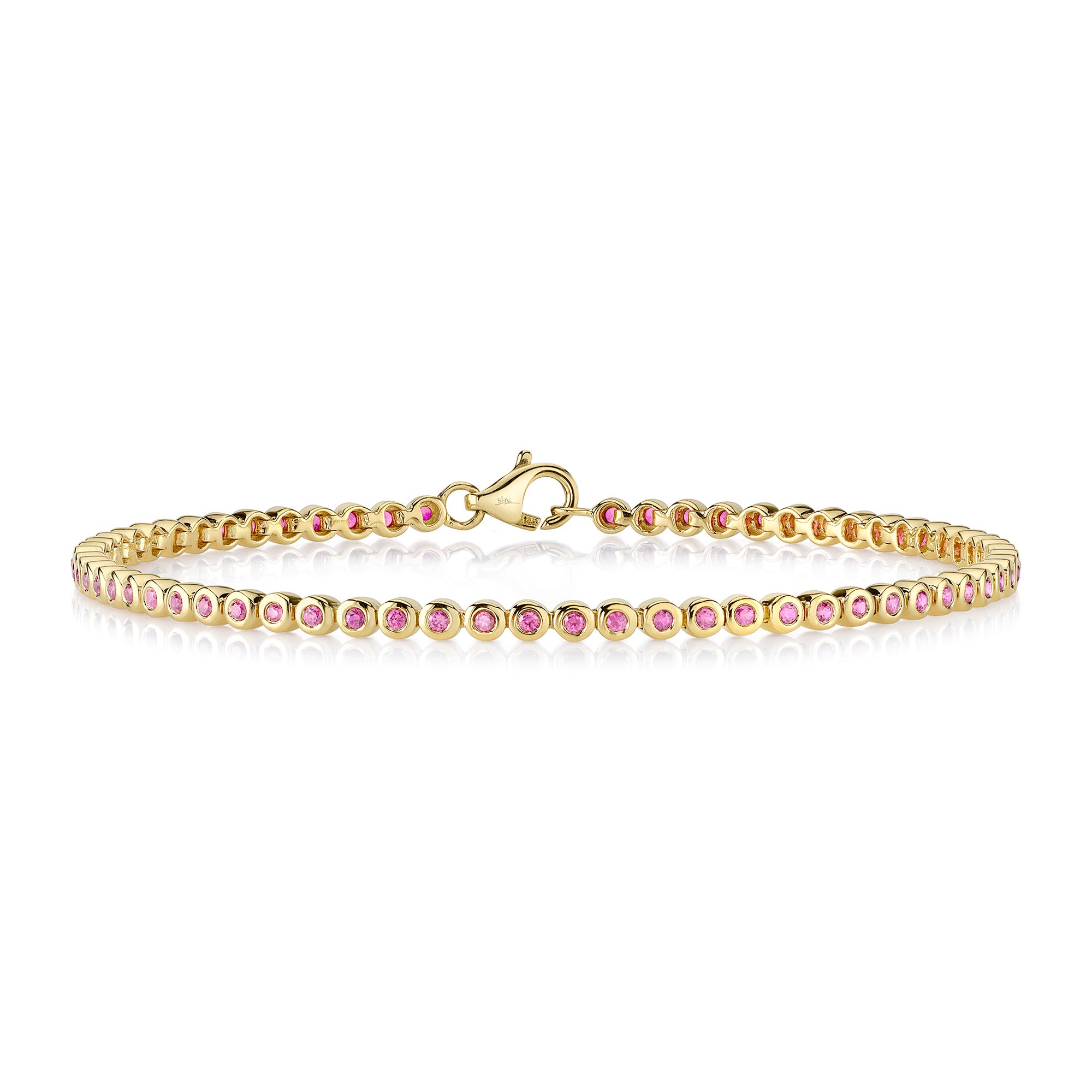 Elegant and feminine, this bezel set pink sapphire tennis bracelet adds a beautiful touch of color to your wrist. The vibrant pink sapphires totaling .80 carats are securely set in polished 14K yellow gold bezels, creating a sophisticated and timeless piece that's perfect for everyday elegance or special occasions.