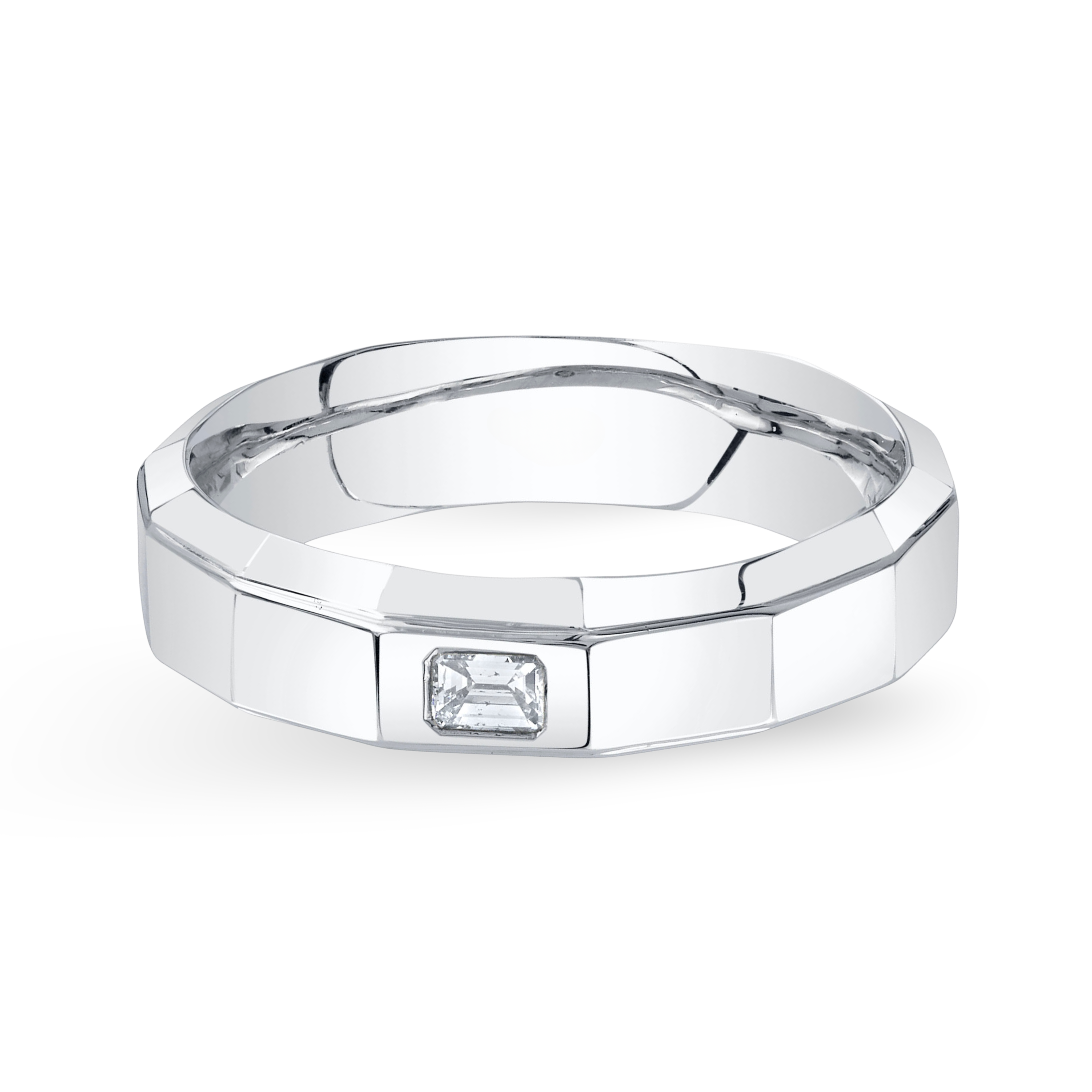 Sleek, structured, and undeniably distinctive. This 14K white gold band features bold geometric facets and a clean high-polish finish, centered with an east-west set emerald-cut diamond totaling 0.19 carats. Its crisp silhouette and minimalist sparkle strike the perfect balance between modern design and timeless elegance.