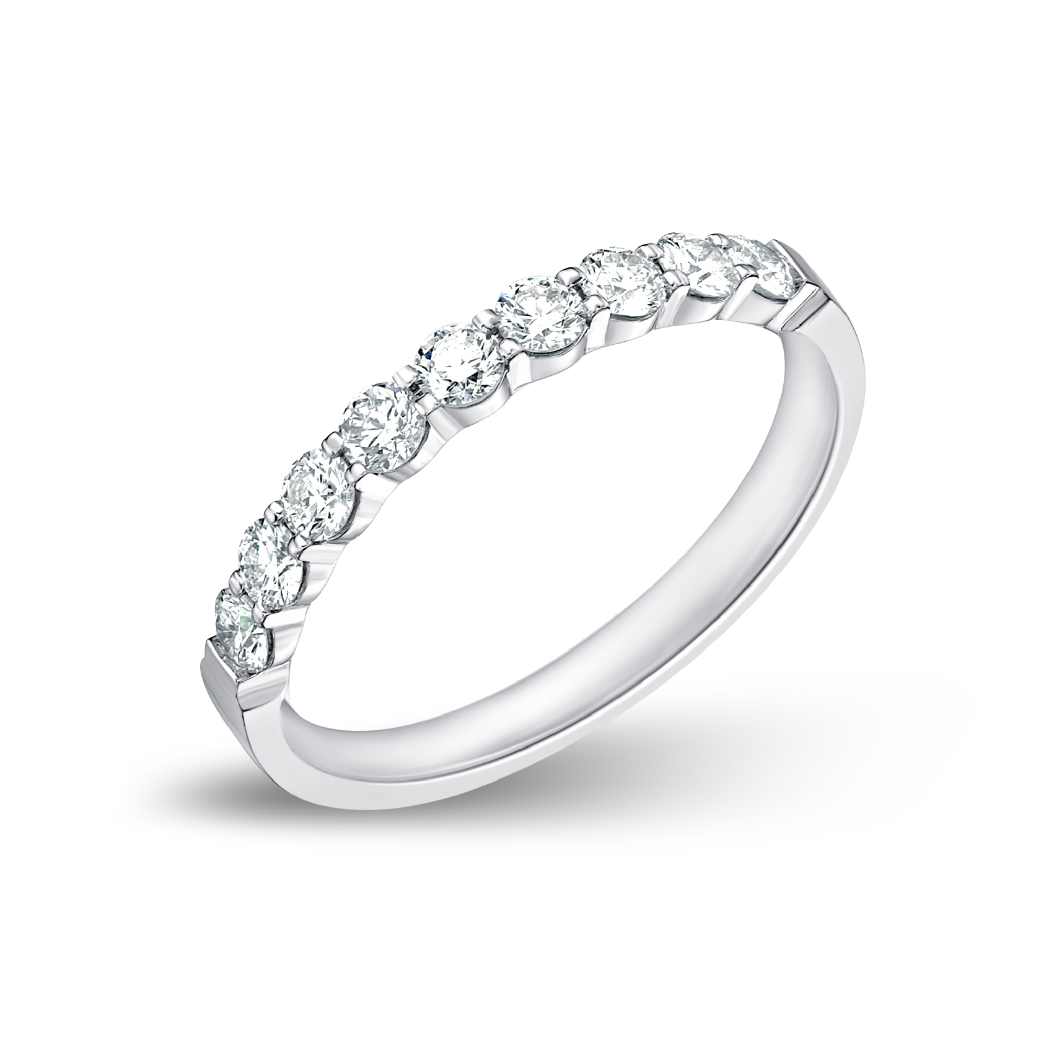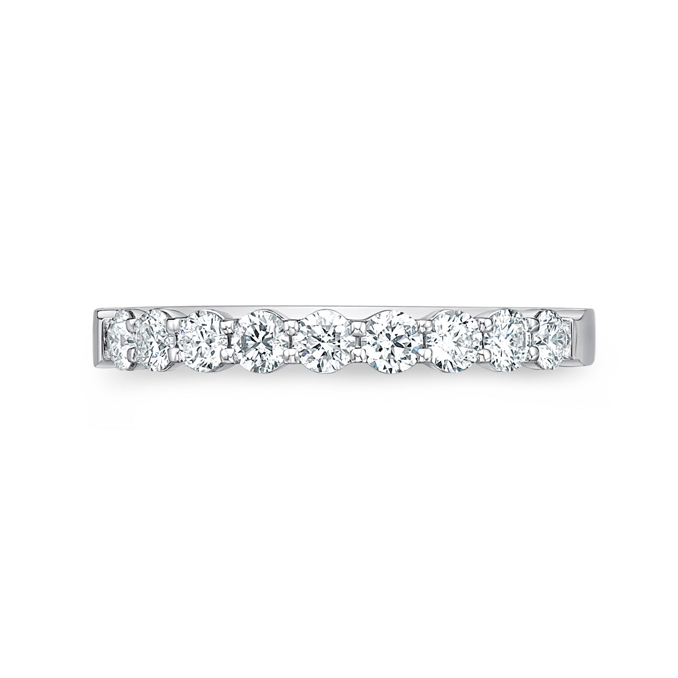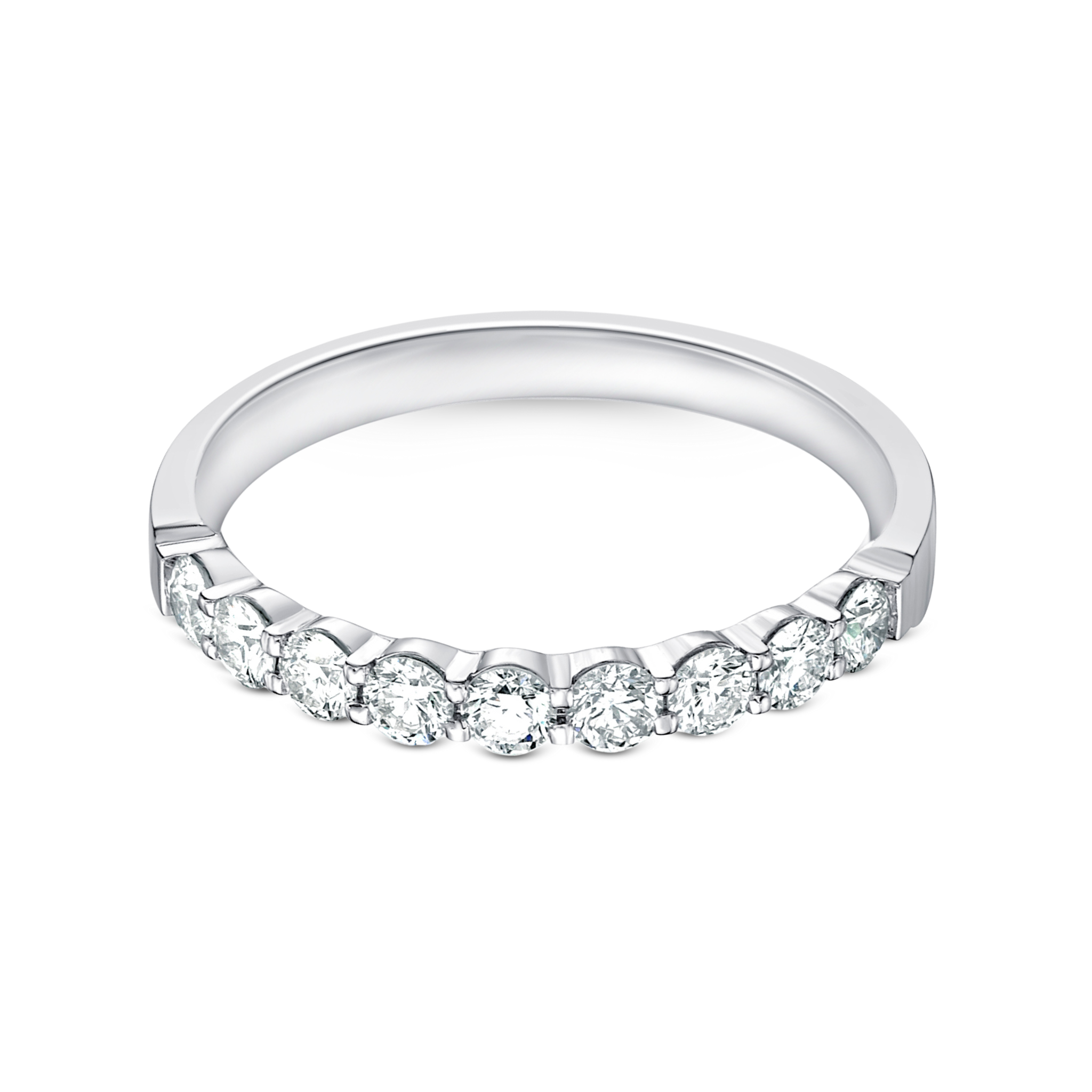 Elegant in its restraint, this diamond band showcases 9 round brilliant diamonds totaling .53 carats, prong-set in cool, enduring platinum. The open setting allows each stone to catch the light with ease, creating a band that is well refined. A quiet staple for stacking, celebrating, or simply wearing every day.