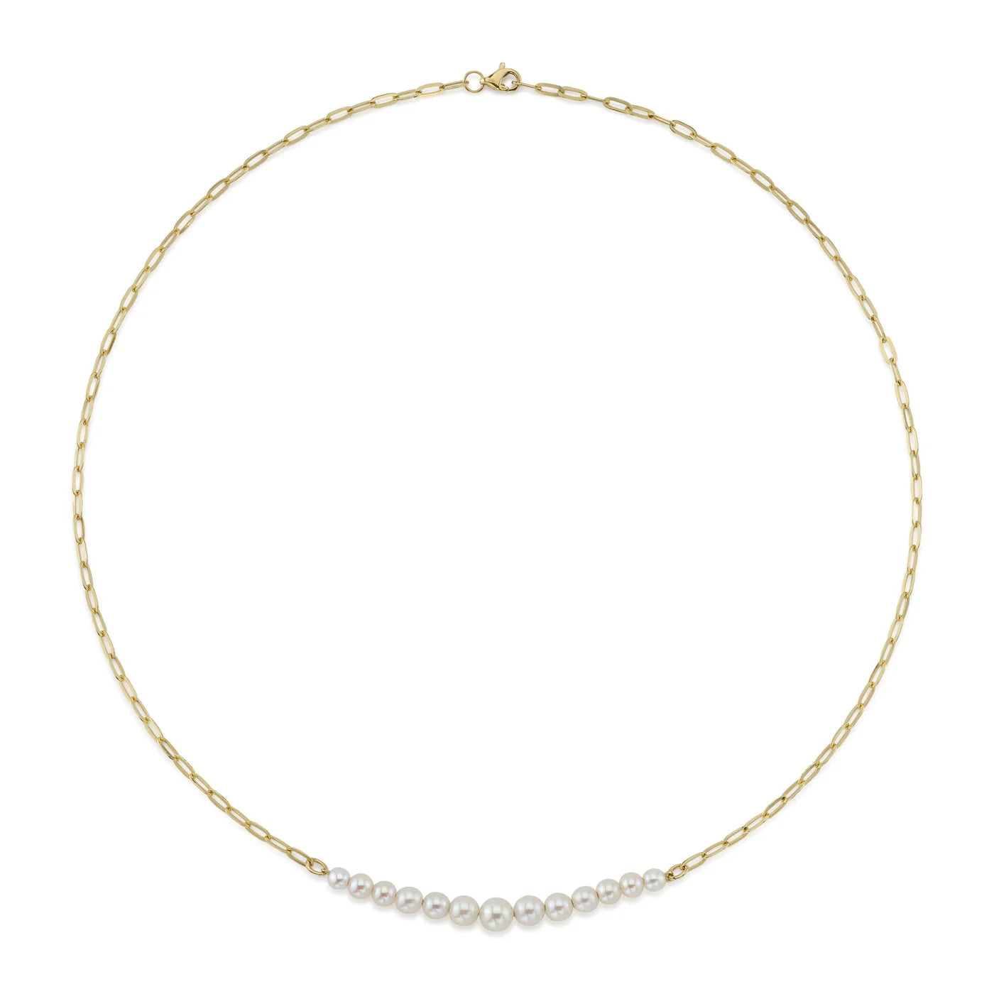 Elegant and refined, this Thirteen Pearls Link Chain features 13 luminous pearls delicately set along a 14K yellow gold chain. Its timeless design adds a touch of sophistication, perfect for layering or wearing as a graceful statement on its own.