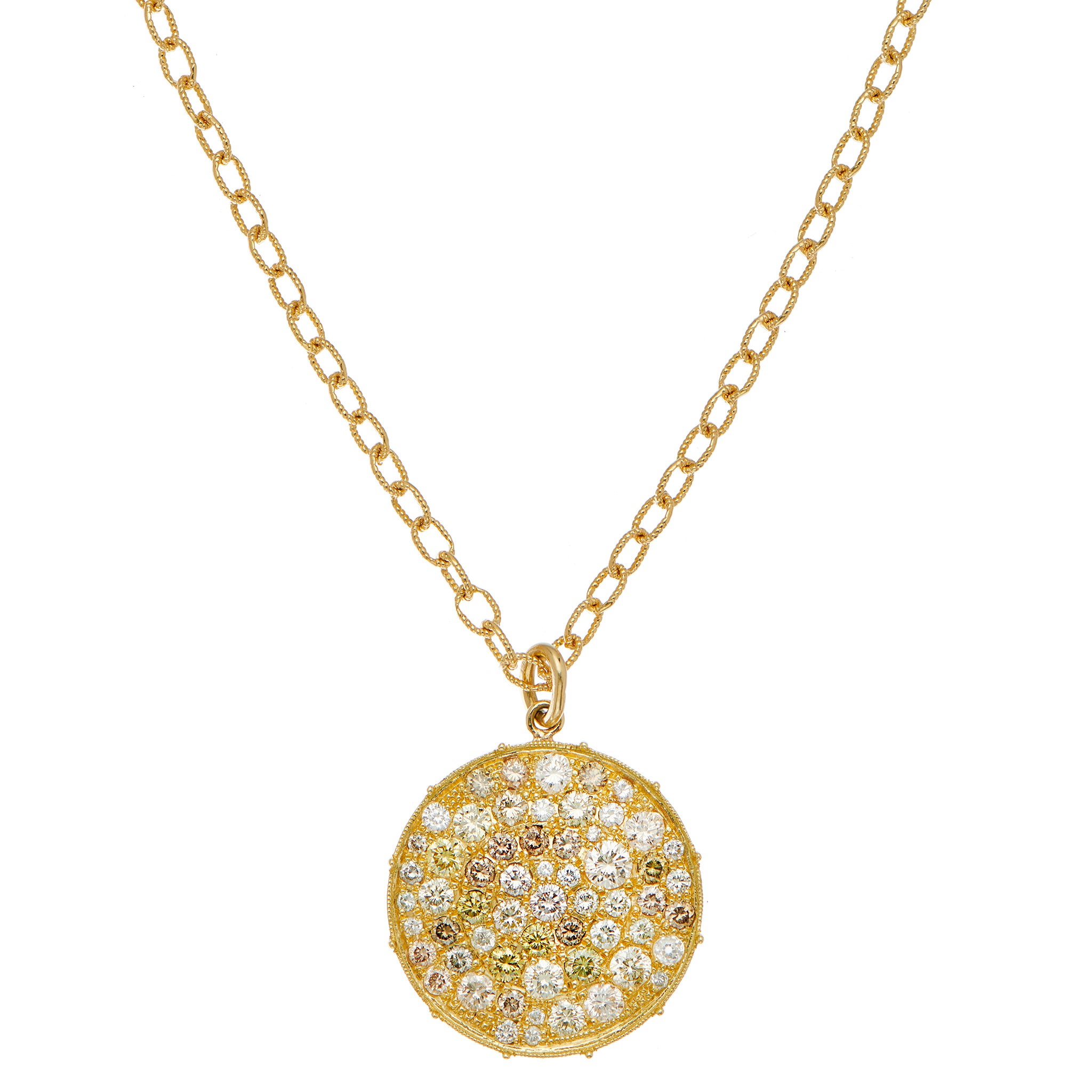 Make a spectacular statement with this 18K yellow gold large disc pendant featuring 3.21 total carat weight of mixed color diamonds. The generous disc showcases a vibrant array of colorful diamonds that create a dazzling display of brilliance and joy. This extraordinary pendant offers substantial sparkle with playful elegance. Perfect for those who love bold, eye-catching jewelry that celebrates color and luxury with exceptional style.