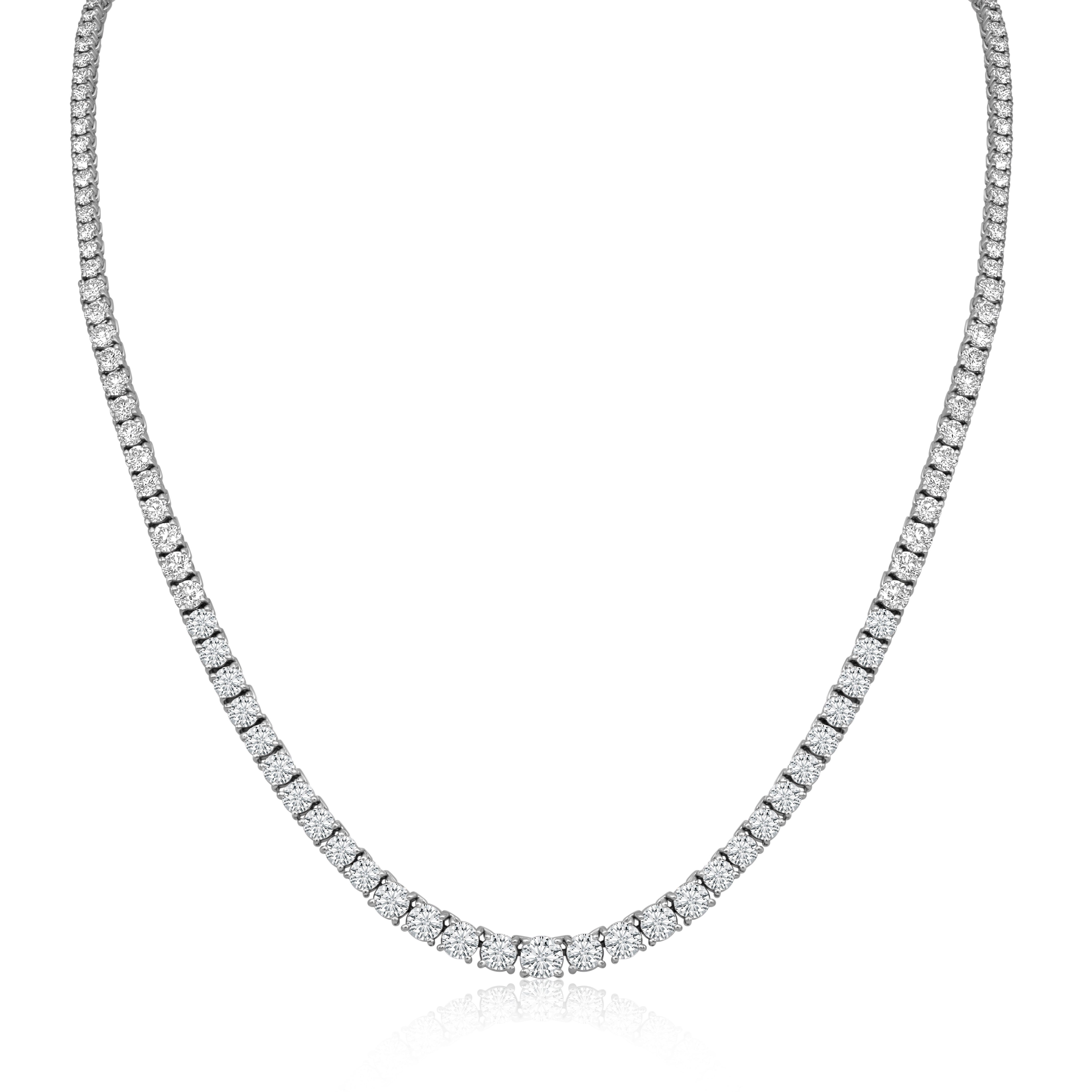 Timeless brilliance, refined to perfection. Crafted in 18K white gold, this necklace features nearly ten carats of graduated round diamonds in exceptional E–F color and IF–VVS clarity. Each diamond flows seamlessly into the next, creating a luminous line of light that rests elegantly along the neckline. Total diamond weight: 9.98 carats.