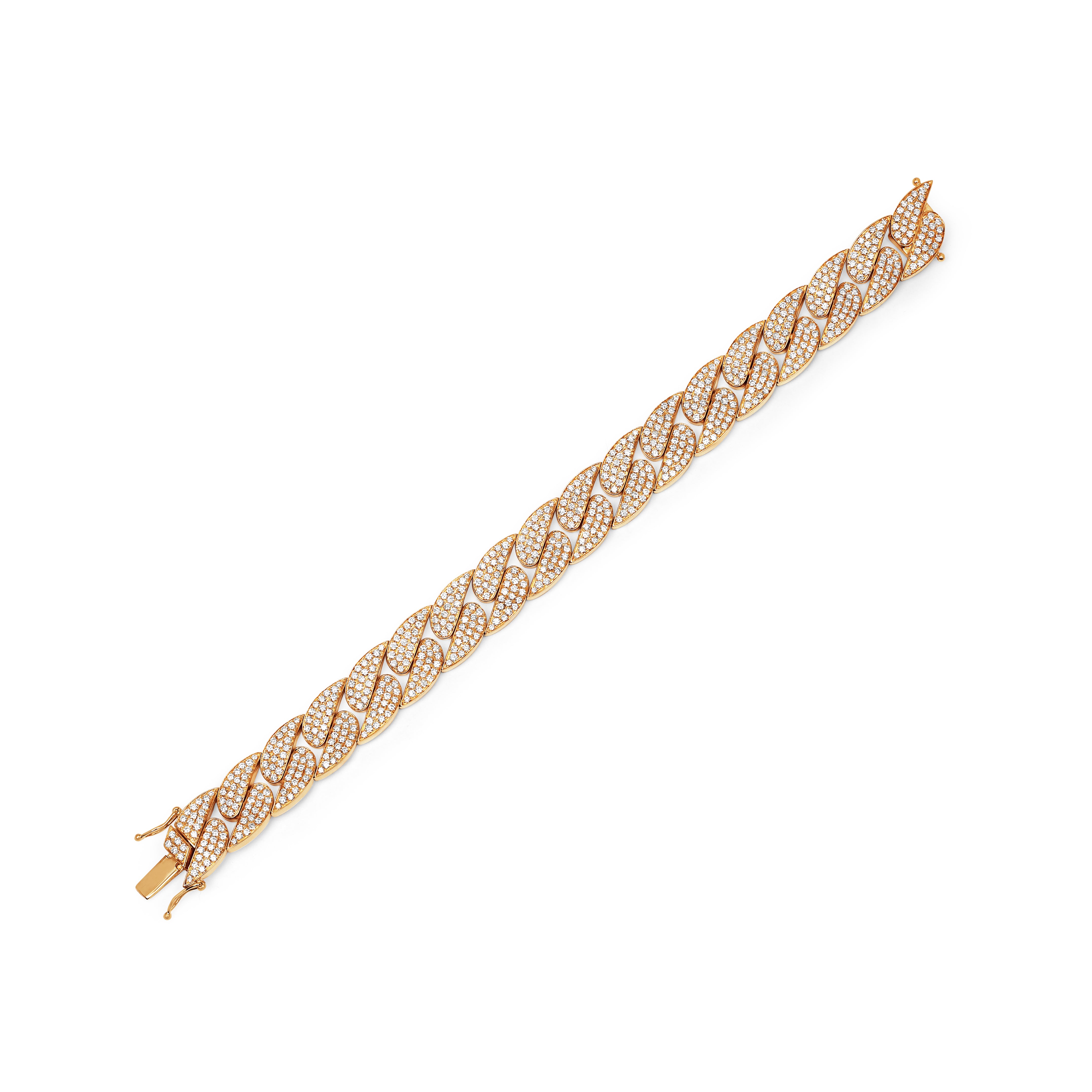 A bold statement of elegance and craftsmanship, this luxurious bracelet features interlocking links fully set with 721 brilliant round diamonds. The warm glow of 18K yellow gold contrasts beautifully with the high sparkle of each stone, creating a radiant and timeless piece that moves effortlessly from day to evening.