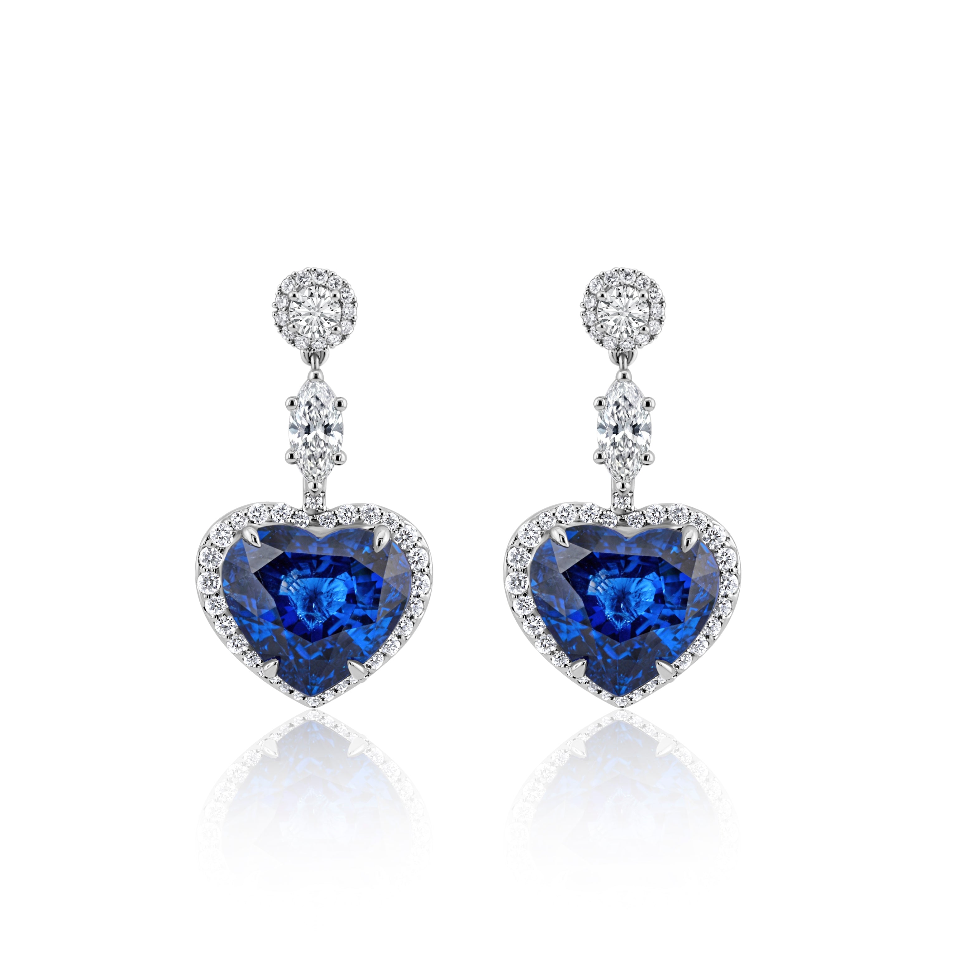 A romantic and striking design, these drop earrings feature two heart shape sapphires beautifully accented by round and marquise diamonds set in polished 18K white gold. The rich blue of the sapphires paired with the brilliant sparkle of the diamonds creates an unforgettable statement of luxury.