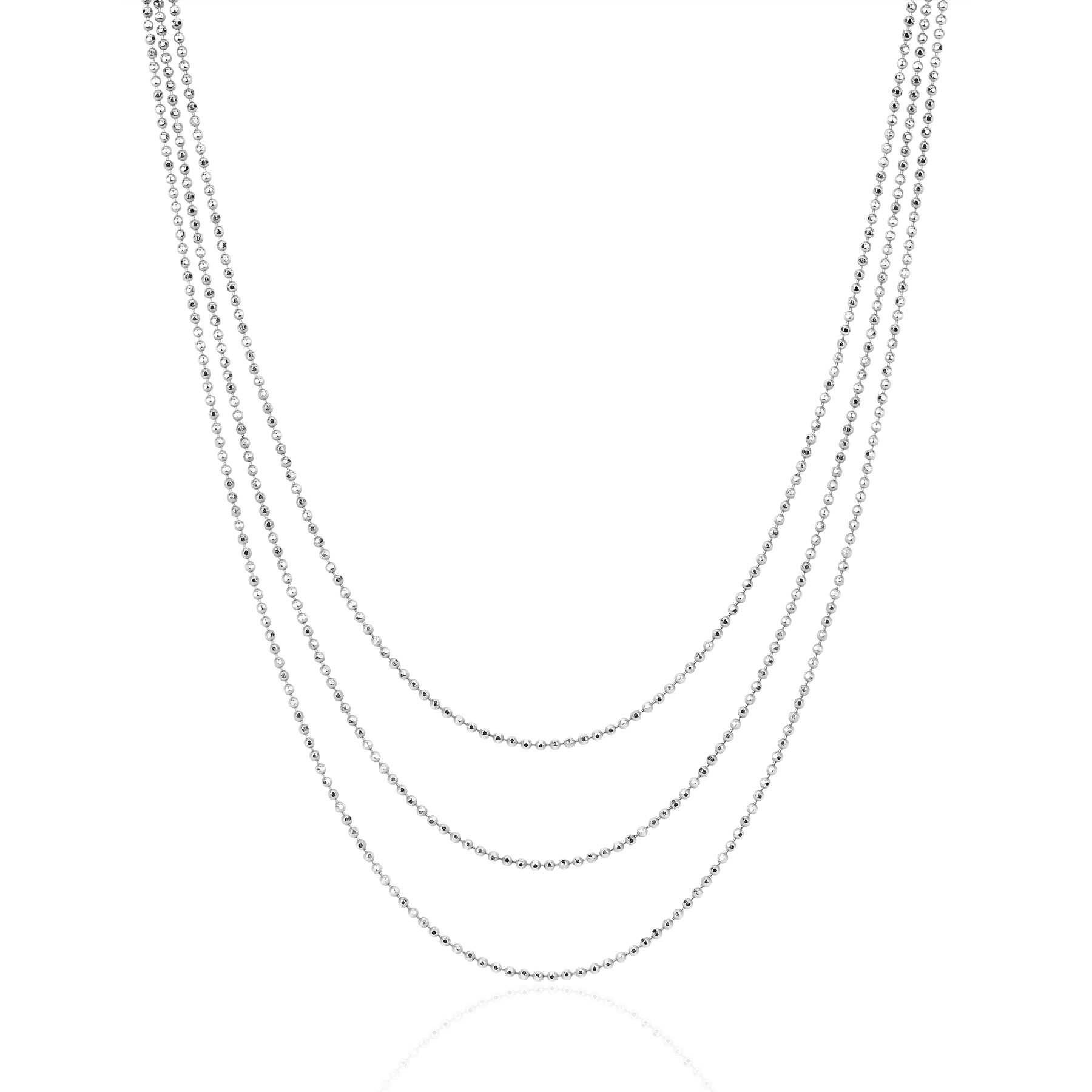 Elevate your layering game with this Three Strand Ball Chain Necklace in 14K white gold. Featuring three delicate ball chains in graduated lengths, this piece adds effortless dimension and shine to any neckline. Wear it alone for subtle elegance or layer with your favorite pendants for a bolder look.