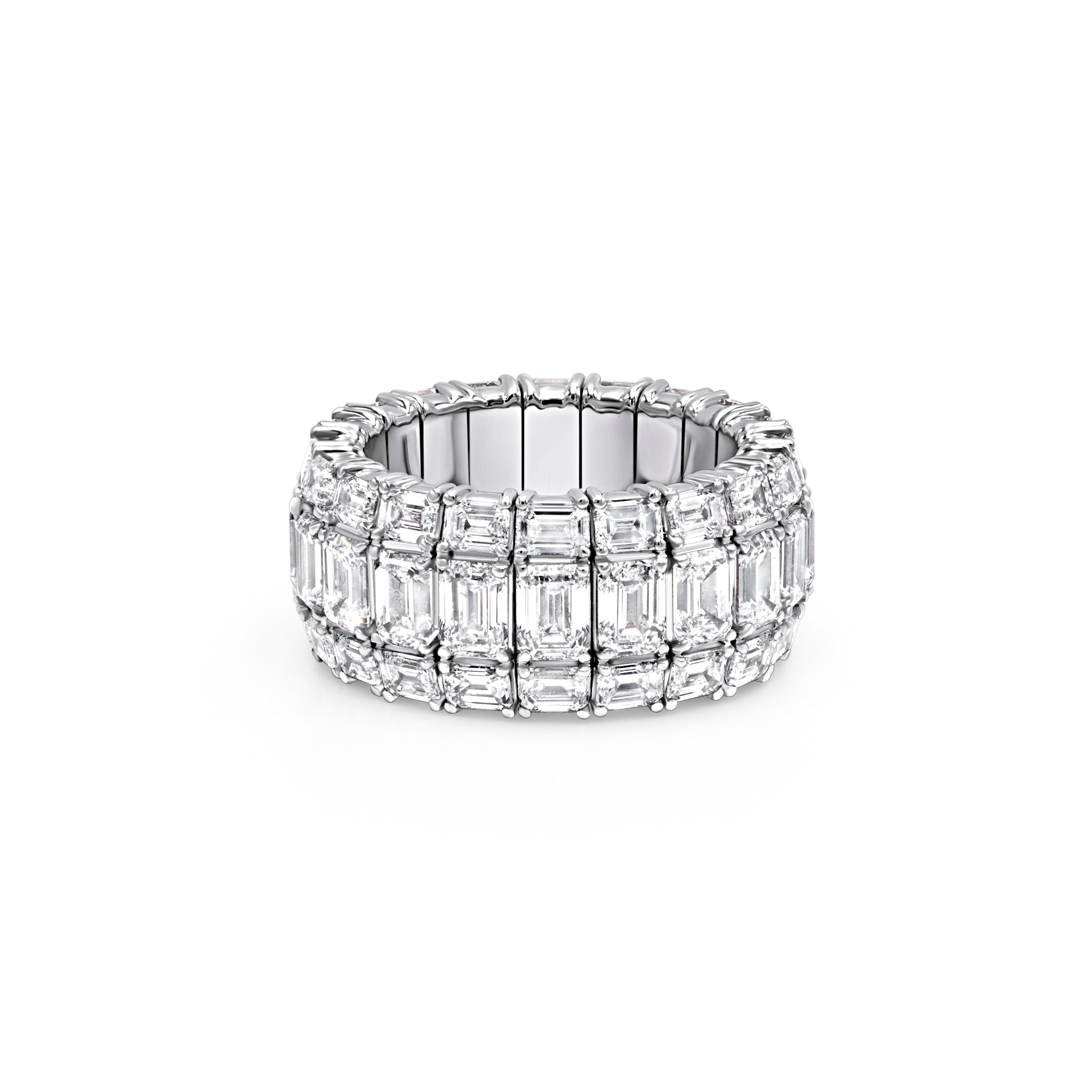 Sophisticated and striking, this Emerald Cut Diamond Stretch Band features 20 GIA-certified emerald-cut diamonds (.30 carats each, D-F color, VVS1-VS2 clarity), complemented by 40 horizontally set emerald-cut diamonds (.11 total carat weight), for an overall total weight of 10.47 carats. Crafted in polished 18K white gold with a flexible stretch design, this band offers bold brilliance and effortless comfort. Perfect worn alone or stacked for a statement look.